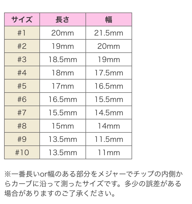 ①ご自身で爪の幅を測っていただく方法 ネイルチップサイズ指定【あり】を選択します。 やわらかいメジャーなどを使って測るか、セロハンテープを爪の上に貼り、印をつけてその長さを物差しで測りサイズ表を参考に番号をご記入下さい。 ②サンプルを取り寄せて測っていただく方法 ネイルチップサイズ指定【なし】を選択し、商品をカートに入れます。 別売りのサンプル(¥110)も一緒にカートへ入れ、そのままご購入手続きを行ってください。サンプルがご自宅に届きましたら実際に爪へのせてサイズをご確認下さいませ。 サイズ番号が分かりましたら指定されたアドレスへご連絡ください。