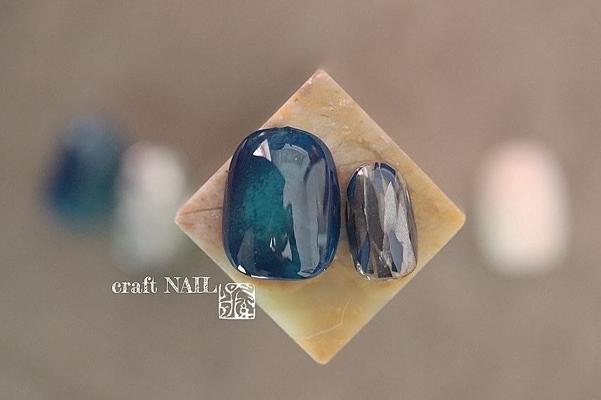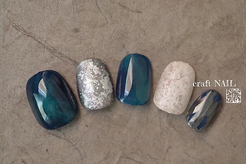 透け感のある紺色のカラージェルに岩絵具(緑青)を重ねて美しい深緑色に仕上げたアートと、月光をイメージしたグレーベースの銀箔アート、ホワイトマット仕上げの銀箔アート、小指には漆シート(藍箔・紺箔)を組み合わせました。