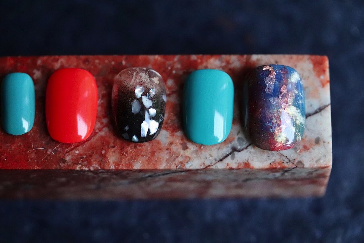 「空飛ぶ宝石」と呼ばれるカワセミをイメージしたネイルデザインです。岩絵具にパール、純金箔(24K)、銅箔、オーロラ箔を組み合わせました。ラメよりも上品でミラー系よりも柔らかい輝きは例えようのない美しさです。