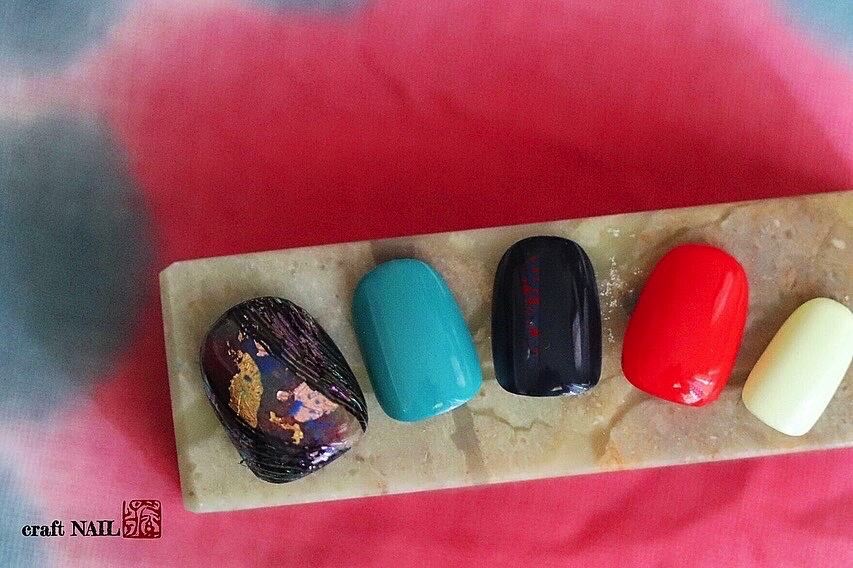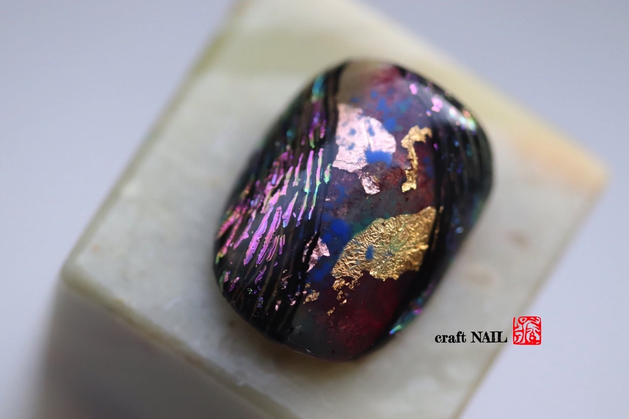 カラスの羽のような艶のある黒(濡羽色)は角度によって虹のように変化し、色彩豊かな世界を我々に見せてくれます。メインアートに純金箔(24K)、銅箔、オーロラ箔と岩絵具を合わせ、上から羽をイメージした細線を描き奥行きを出しました。濃紺のカラージェルに漆のシートを合わせ、シャープな印象に仕上げました。