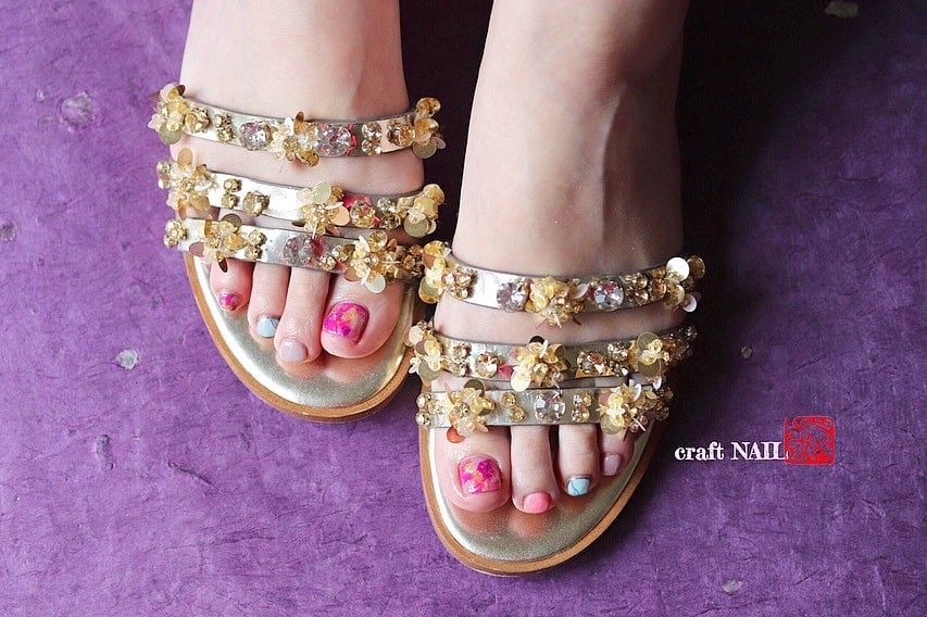 A bright pink nail design using pure gold leaf. Purple and neon colors are also added as little accents to express a glamorous and mature look.