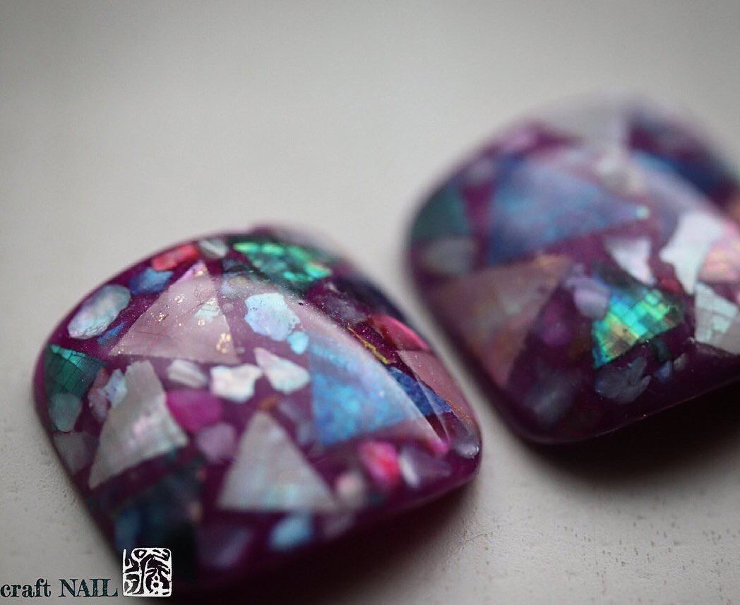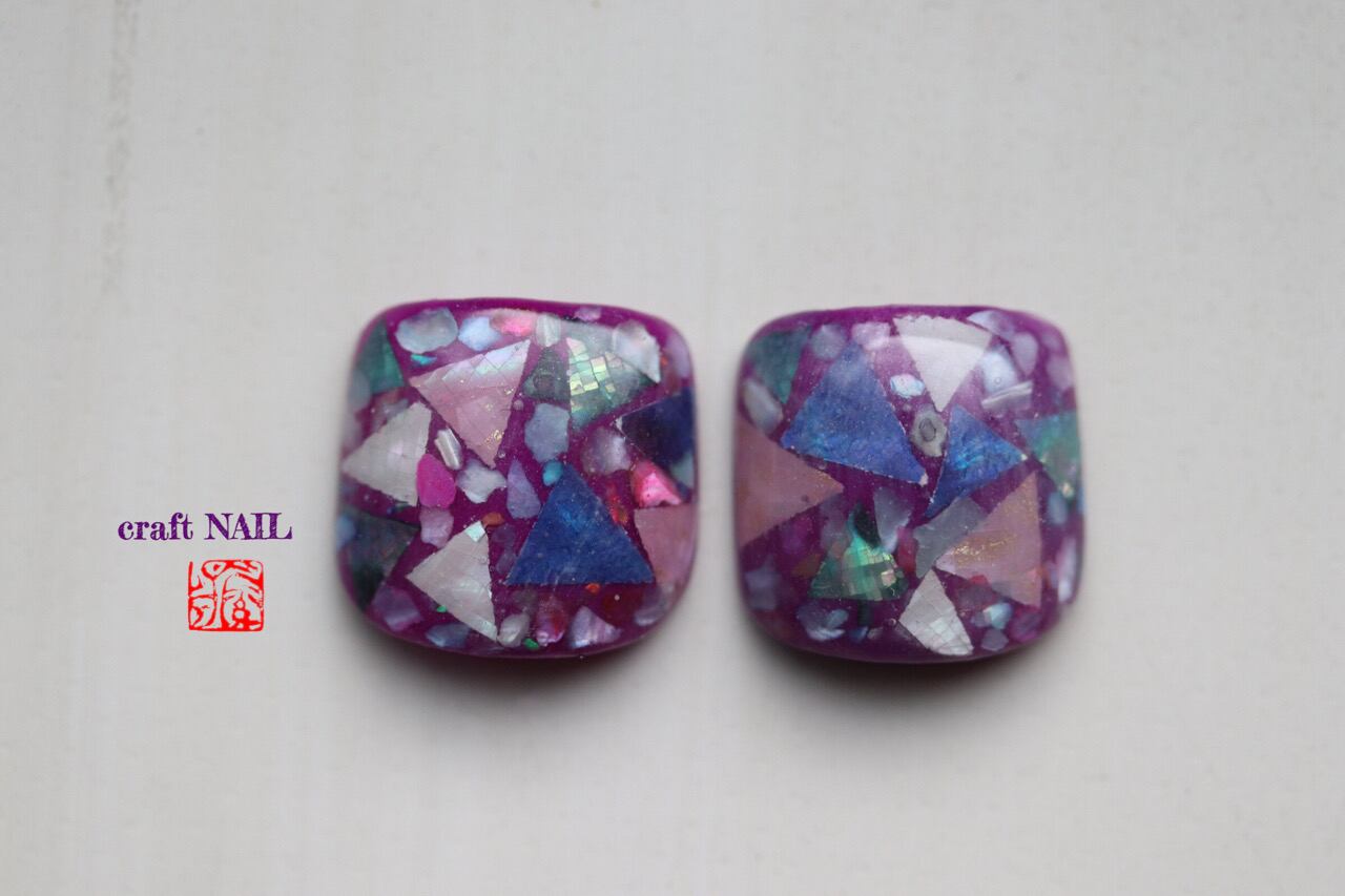 赤みがかった紫色をベースに螺鈿とシェルの破片、京都オパールをあしらった、ポップで凛として艶やかなネイルデザインです。