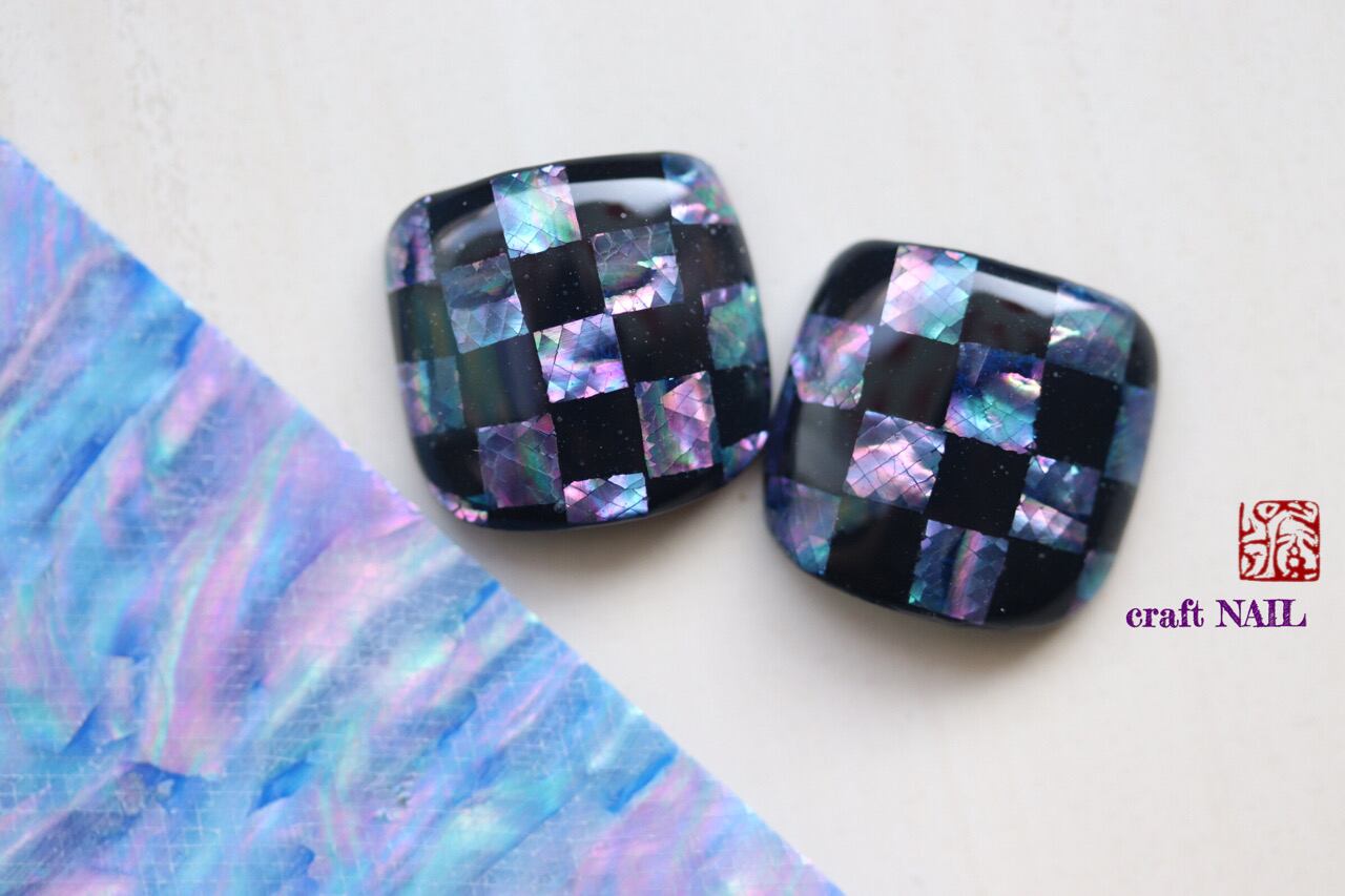 A cool and elegant checkered pattern is created using sheets of Japanese abalone on a dark blue base. It is a mature and elegant design.