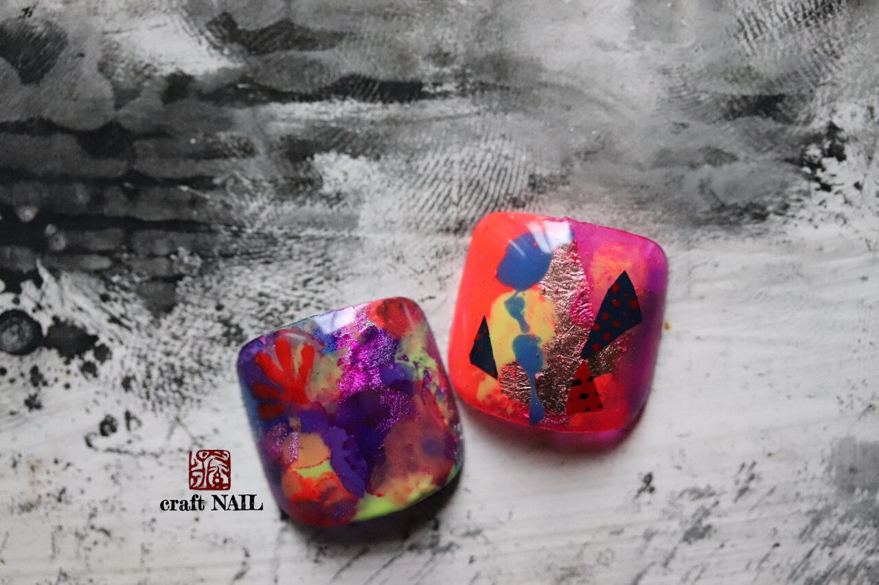 インクアートに純銅箔と漆のシートをリズム良く配置し、ネオンカラーで抽象的なイメージを描きました。