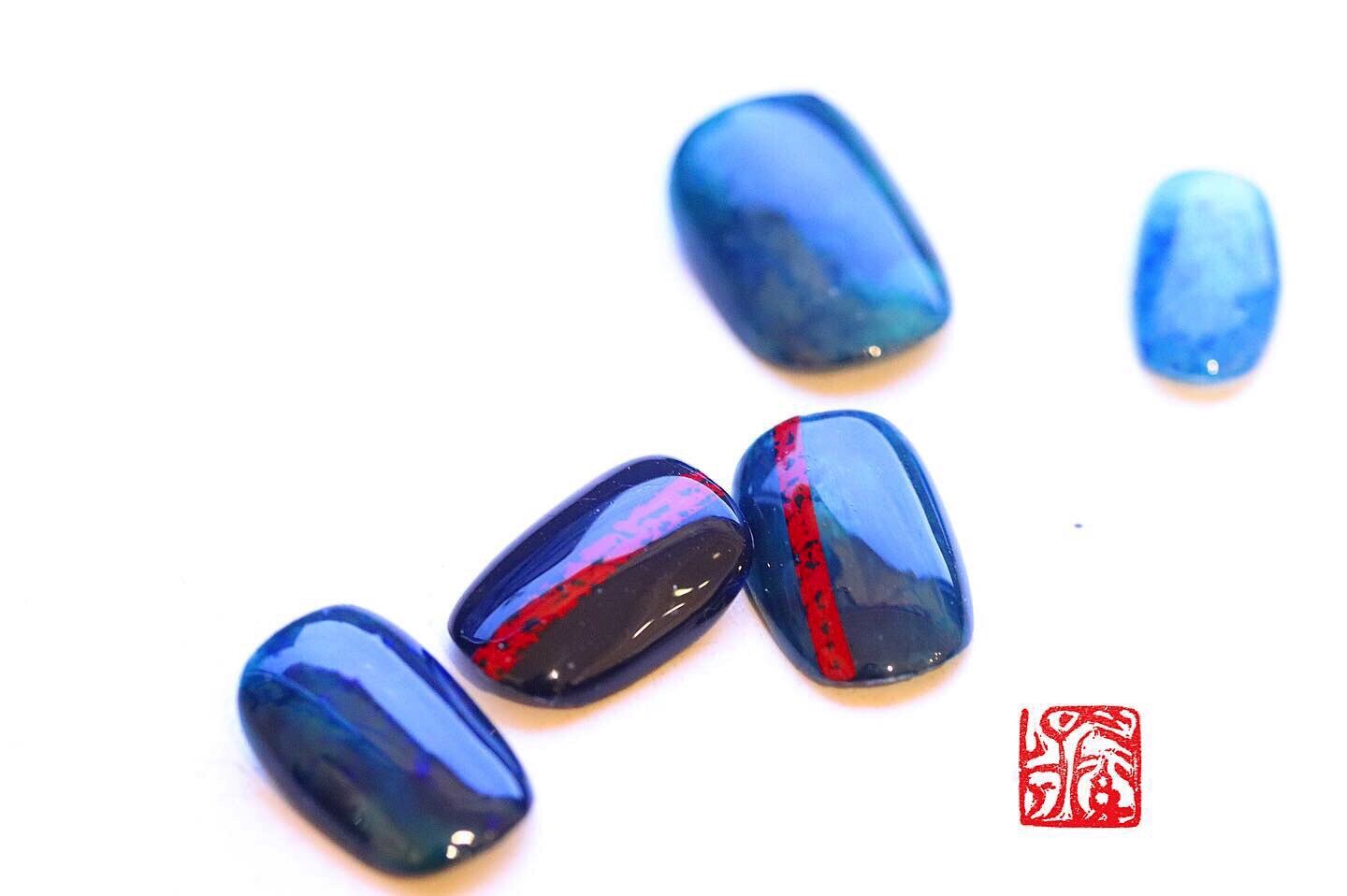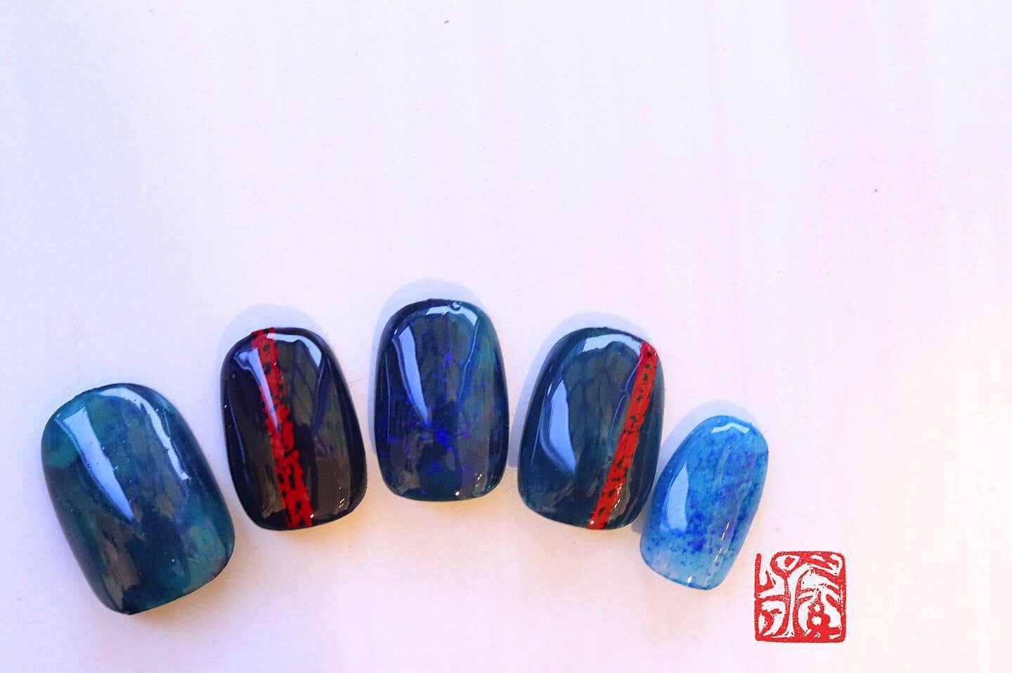 深緑のような青緑色のカラージェルに岩絵具を重ね、漆のシートで深紅のラインを作りました。